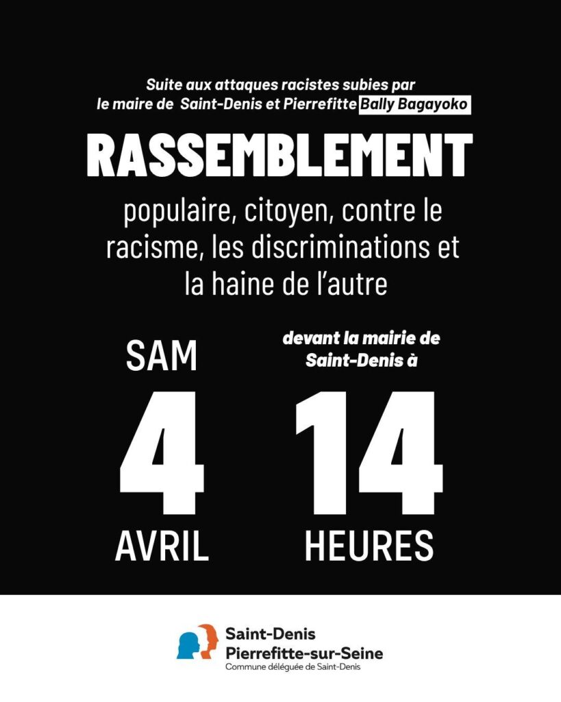 Rassemblement populaire et citoyen contre le racisme, les discriminations et la haine de l’autre. Rendez-vous samedi 4 avril à 14h devant la Mairie de Saint-Denis.